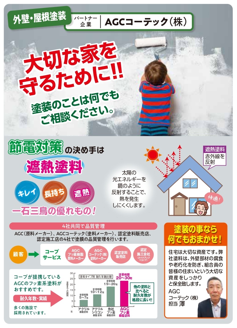 コープが提携しているAGCのフッ素系塗料がおすすめです。耐久年数が長く多くの施設で採用されています。
