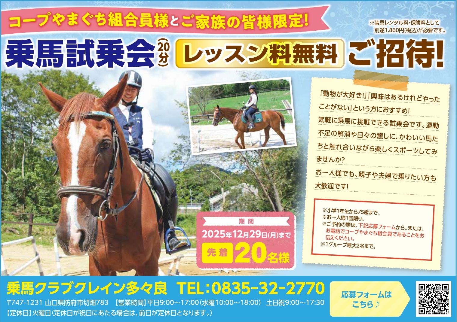 乗馬クラブクレイン多々良 気軽に乗馬に挑戦できる試乗会です。 乗馬は、年齢に関係なく無理なく体を動かすことができるスポーツです。 日々のストレス解消に…かわいい馬たちと触れ合いながら癒されてはいかがですか? 乗馬試乗会(20分)&レッスン料無料ご招待! 2025年12月29日(月)まで 先着20名様 TEL 0835-32-2770 受付時間 平日9:00~17:00(水曜10:00~18:00)土日祝9:00~17:30火曜日定休日 乗馬試乗会のお申込み お問い合わせはこちら こちらのサービスもおすすめです 雑草・お墓の清掃お困りではないですか? 組合員特典 初回ボトル3本無料 特別価格にて ご受講いただけます