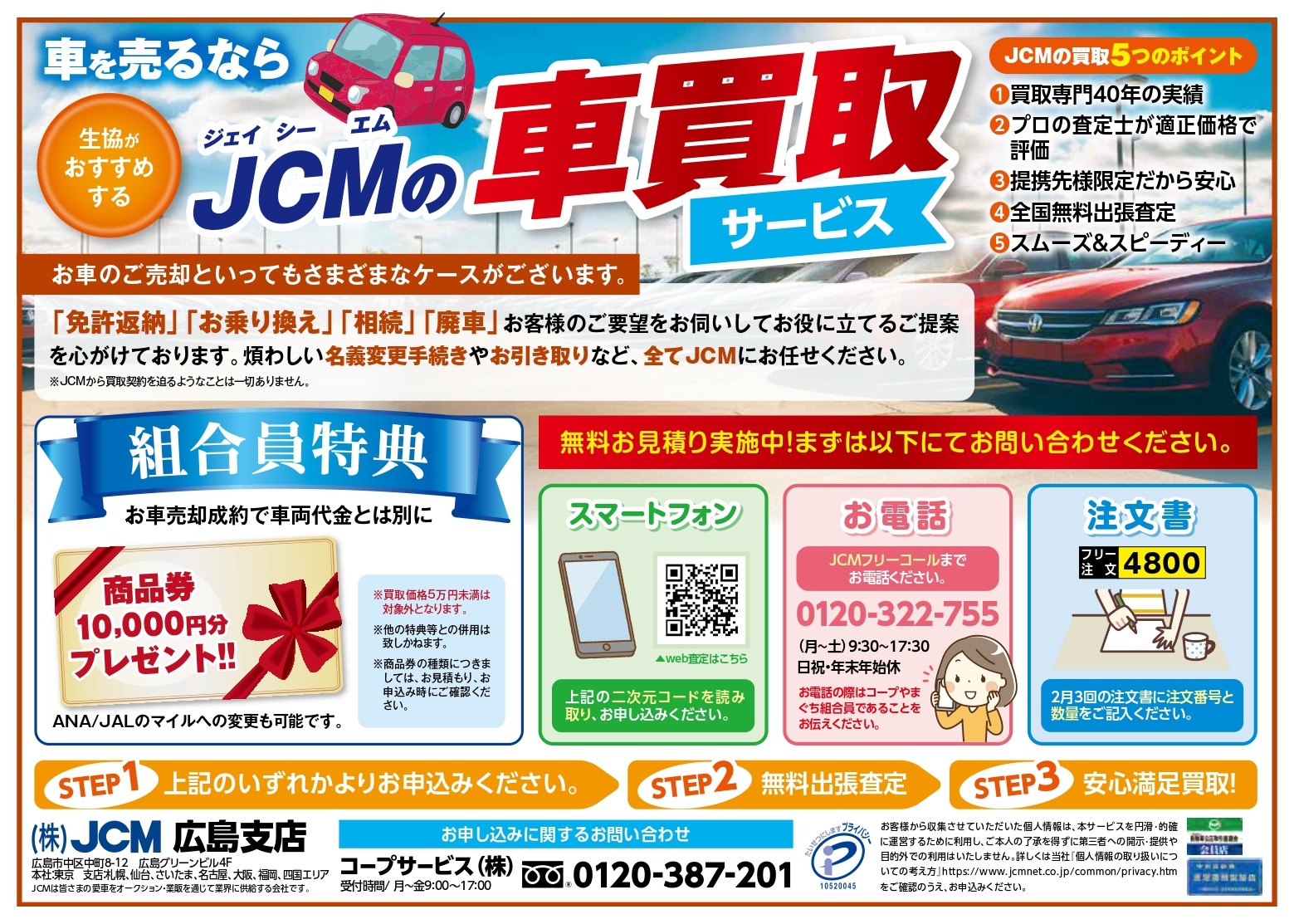① (株)JCM 0120-322-755 にお電話で「コープやまぐち組合員」である旨をお申し出ください。