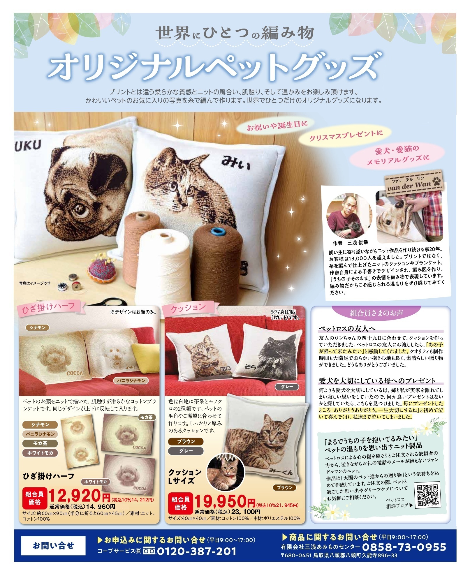 (編み物で作る)オリジナルペットグッズ 大切なペットの写真を糸を編んで作る世界にひとつだけのオリジナルグッズ!プリントとは違う柔らかな質感とニットの風合い、肌触り、そして温かみをお楽しみいただけます。 定価より5%OFF&送料無料 例:クッションLサイズ通常価格¥21,000(税込¥23,100)→特別価格¥19,950(税込¥21,945) ~クッションができるまで~ 詳細・お申込みはこちら お問い合わせはこちら こちらのサービスもおすすめです 組合員特典 5%OFF&送料無料